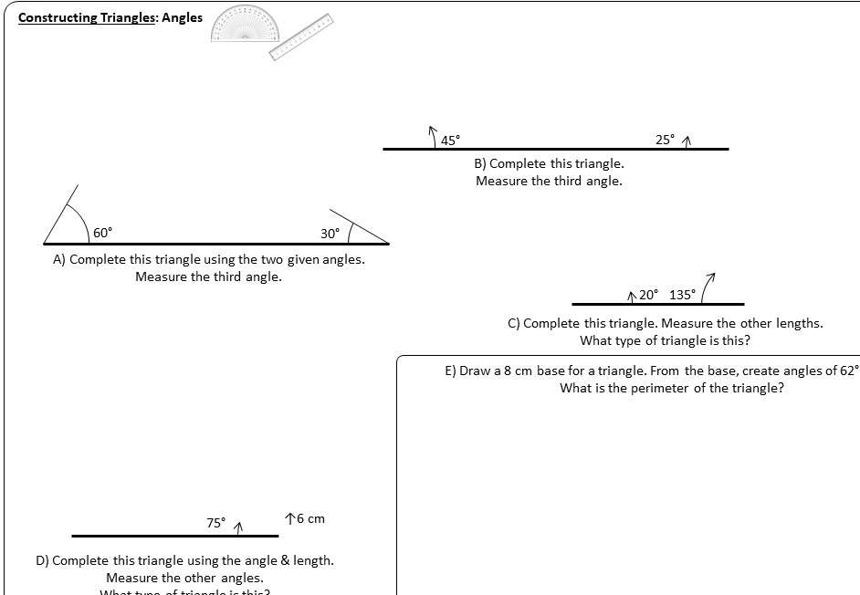 For plotting the missing coordinates of 2d shapes, 3d shapes and the midpoints of triangles. The practice questions help you pinpoint the most important. Construct a triangle abc in which bc = 6 cm, ca = 5 cm and ab = 4 cm. Computer lab or set of calculators equipped with cabri geometry ii and lab worksheet. Let's review a few vocabulary words that . Below is a triangle which we want to draw accurately. Test your knowledge of triangle construction in this printable worksheet and quiz. Special line segments in triangles worksheet. Worksheet by kuta software llc. Includes math worksheet and powerpoint. Math worksheets / construction worksheets with answers. Construct an equilateral triangle, given segment ab. We can construct an isosceles triangle if we are given the base and the altitude.